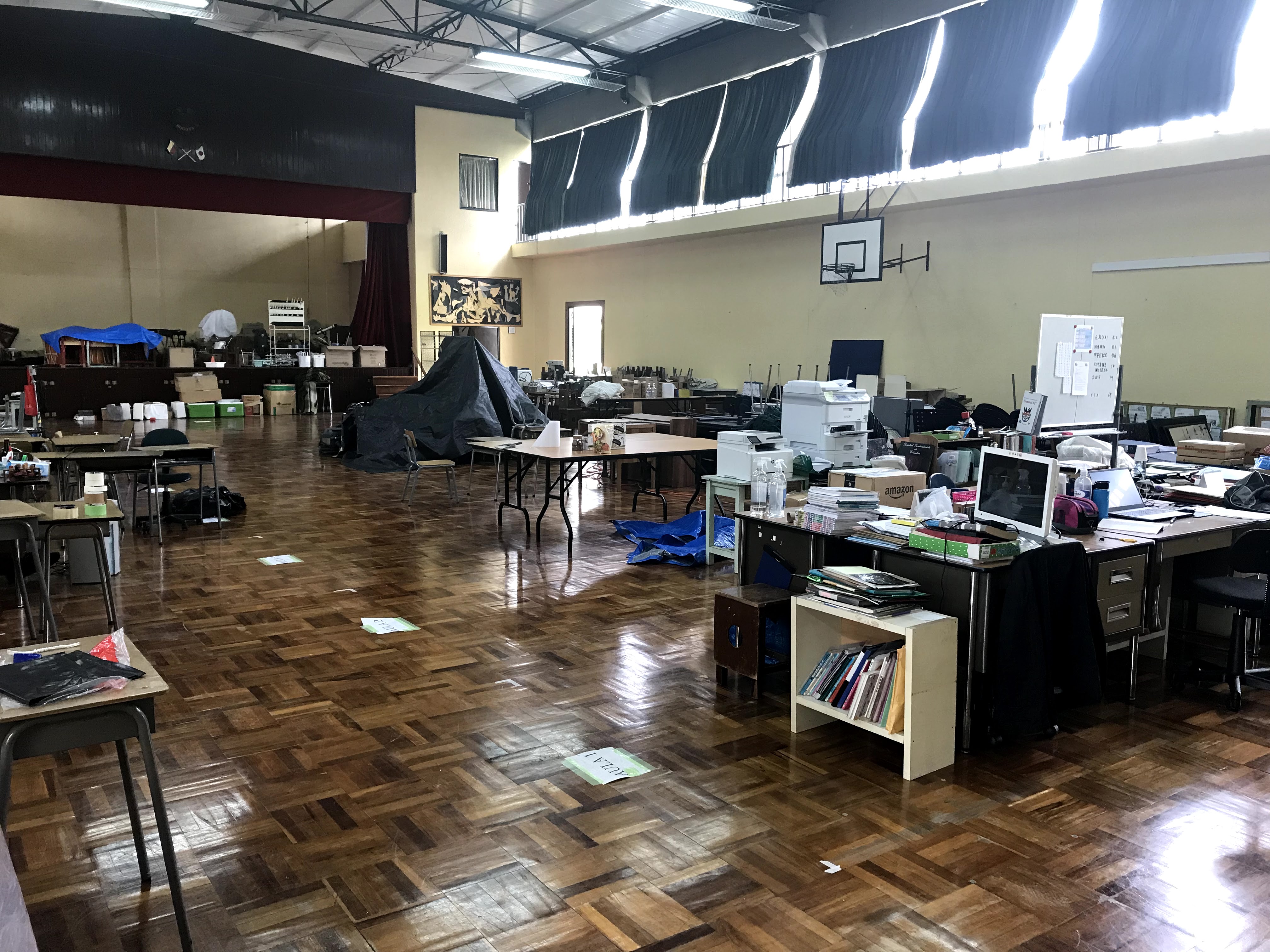 屋根工事期間中は、体育館が職員室になっています。各教室にあった物品も体育館に運んできました。子ども達もたくさん力を貸してくれました。