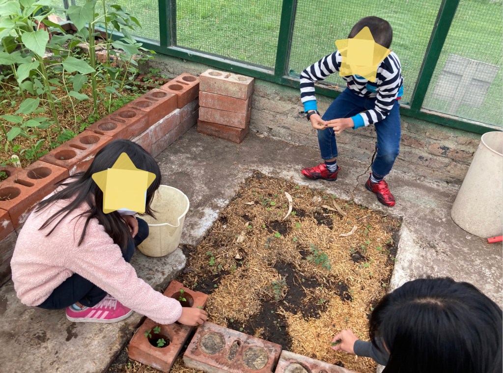 1・2年生の子ども達は、毎朝に畑やビニールハウスにある植物のお世話をしています。お世話の内容は、水やりや草抜きです。その水やりや草抜きも1・2学期と比べるととても上手になってきました。
