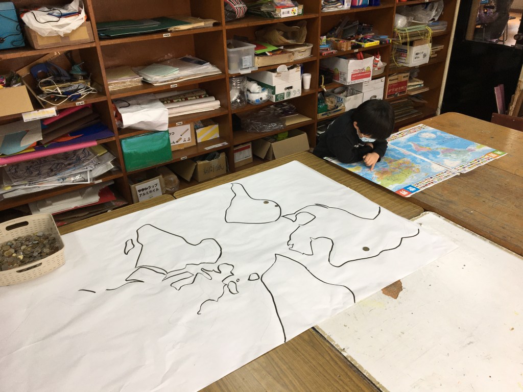 世界地図を見ながら中学生と一緒にどこの国のお金かを分類しました。