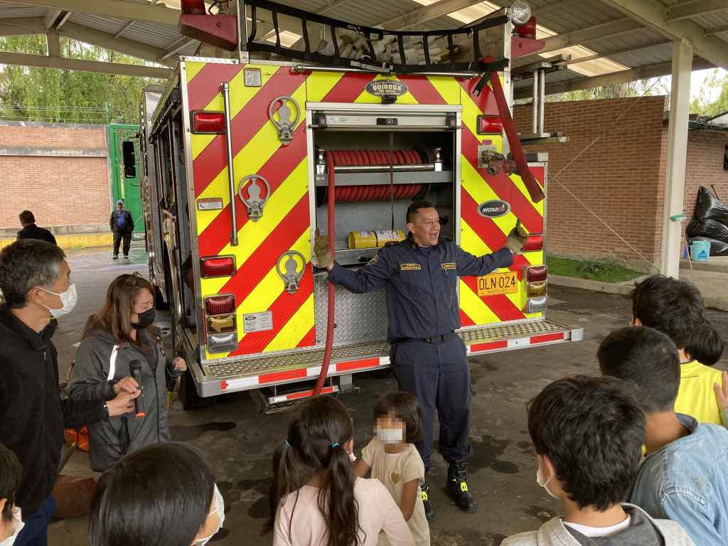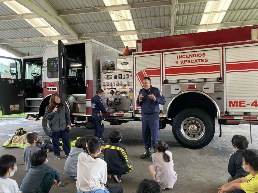 また、今回はボゴタ消防署から消防士と消防車をお招きし、ボゴタ市で起こる火災状況や消防士の仕事についてお話していただきました。日本と共通するところ、違うところ、様々な学びがある時間となりました。