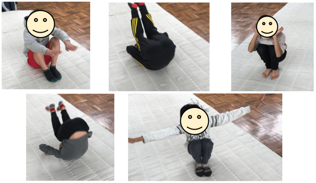 3年生から中学部は「前転」「開脚前転」「後転」「開脚後転」「側方倒立回転」「壁倒立」を扱いました。練習を重ねるごとに着手や着地、目線など、細かいポイントまで意識するようになり、きれいな技を決めることができるようになりました。