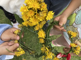 1・2年生は、生活科で「きれいにさいてね」の学習を行っています。本日は、中庭に咲いているタンポポで花冠を作りました。作るのはなかなか難しかったものの、作り終えると「家に持って帰ってもいいですか。」「お母さんにあげます。」などの声が聞こえてきました。自然にある植物から物を作り上げる活動ができるボゴタ日本人学校。改めて恵まれた環境の中にある学校だと感じました。