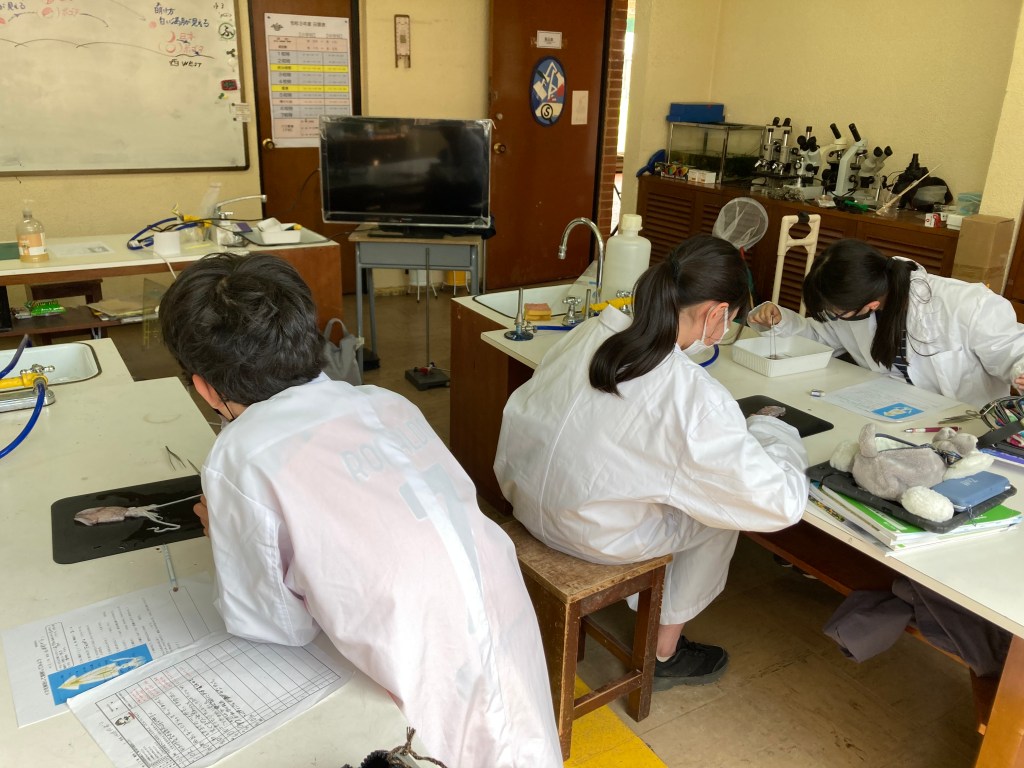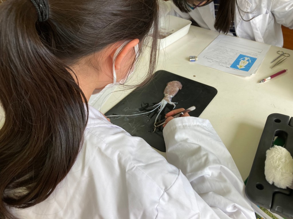 中学部1年生の理科では、無セキツイ動物で軟体動物であるイカの解剖を行って、体のつくりを学びました。食材として一杯の姿があるイカが手に入ったので、実施しました。長い触腕やカラストンビと呼ばれる口、外とう膜を開いて見えるえらや墨袋、目の水晶体などに興味を持って取り組みました。白衣もよく似合っていますね。