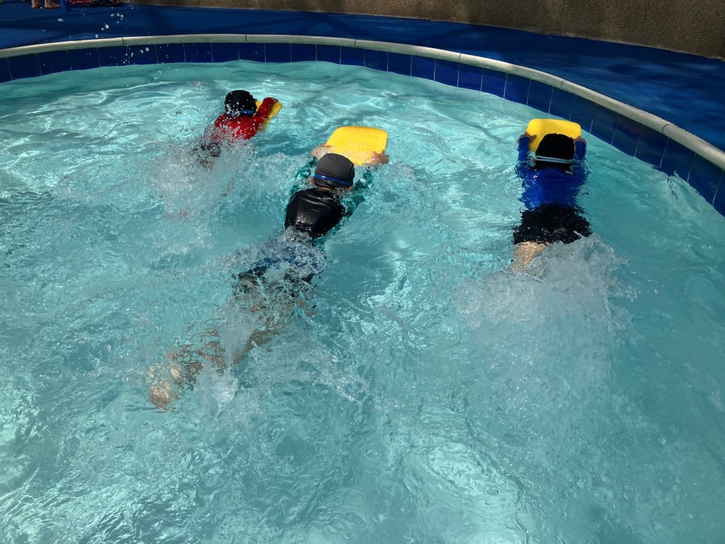 初日でしたが、何度も何度もプールを往復して練習している子、タイムを計って自分の泳力を確かめる子、水が苦手だけれども顔をつけようと少しずつチャレンジしている子など、自分でめあてを決めて学習している姿が見られました。