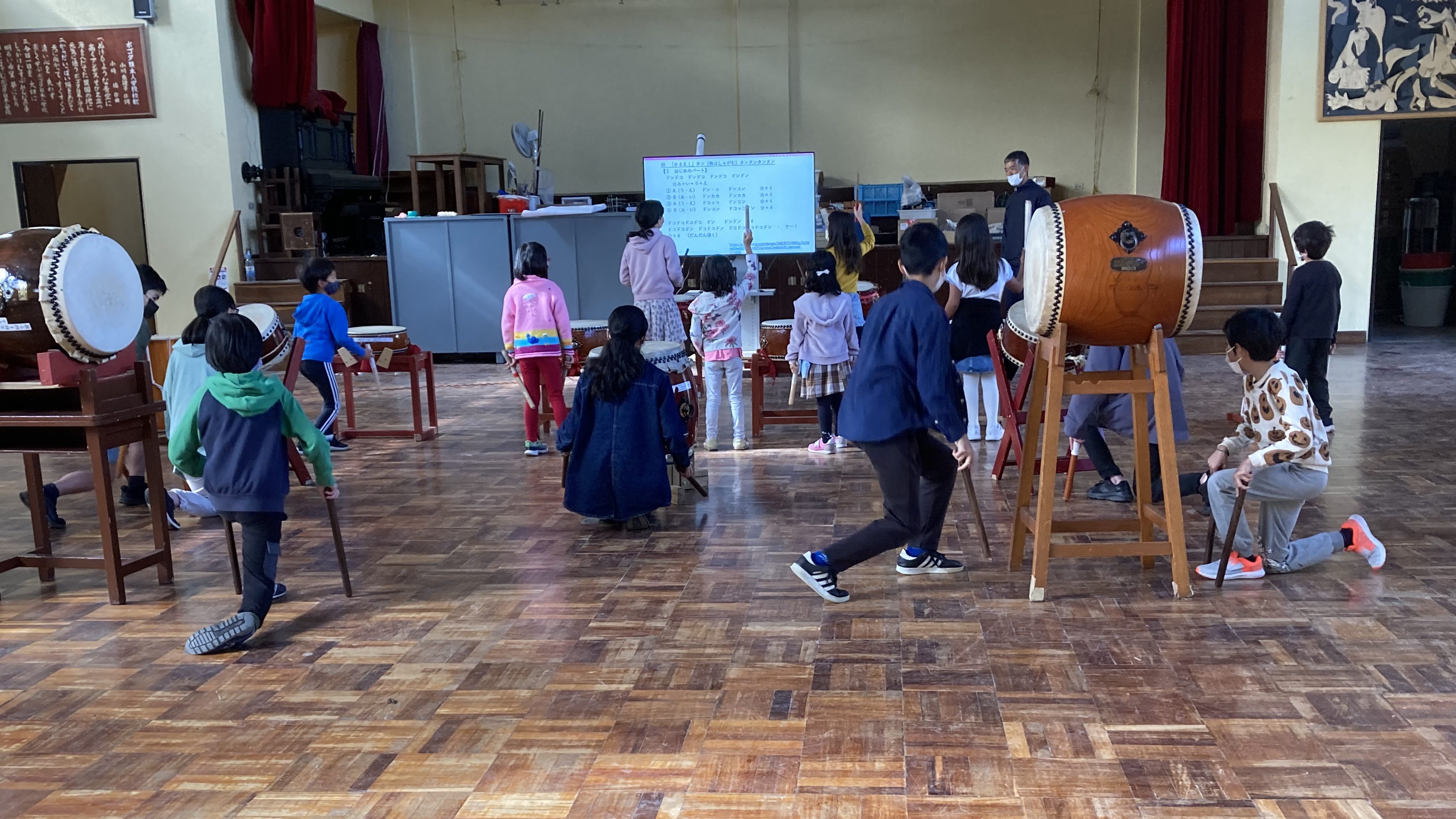 和太鼓の演奏は、次の発表機会である学習発表会に向けて、どの太鼓をたたくか役割を一新して臨みます。長太鼓、しめ太鼓などの太鼓の種類と特徴を学んだ後、児童生徒と先生が相談して新たな分担を決めました。「この太鼓をたたきたい」という希望をもった生徒が多く、意欲が感じられました。この日の朝の活動では、その新しい布陣で、最初の本格的に音を合わせる練習になりました。ここからどんどん上達していくことでしょう。