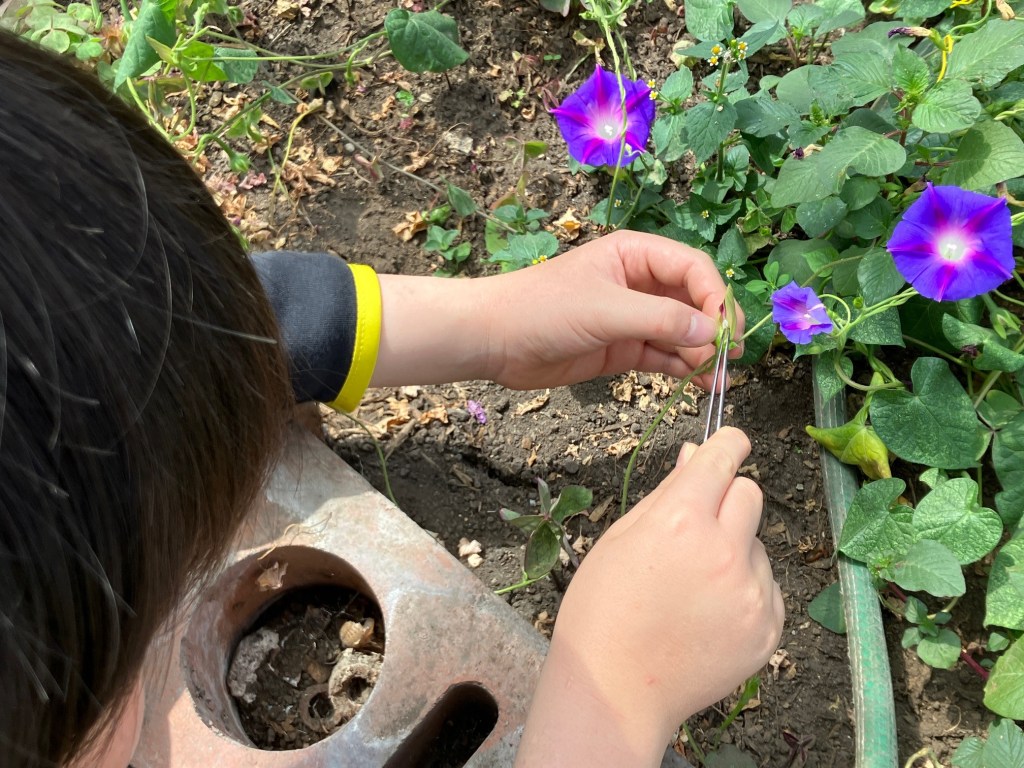 花壇では、受粉させた花と受粉させなかった花の変化を調べる実験をしていました。ふくらんだアサガオのつぼみを開いて、ピンセットでおしべをとって袋をかけます。そして花が開いたら、一方に受粉させて、もう一方はそのままにしておくそうです。 「変える条件は・・・、変えない条件は・・・」と、結果を比較するために、自分の力で条件を整理しながら取り組んでいました。