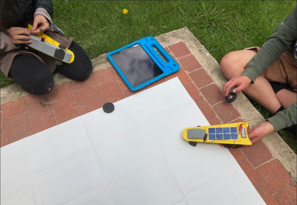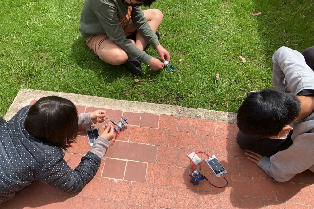 小学校6年生の理科で、電気の利用の学習が進んでいます。この日は晴天だったので、光電池から電流を取り出す実験をしました。光電池から得た電流で、モーターと電子オルゴールを鳴らしましたが、両方を一緒につなぐと、オルゴールは鳴りますが、モーターは回りませんでした。「どうしてか?」考えていると、回路が直列であることに気づき、並列につないだら両方動くことが分かりました。また、光電池を用いた車のキットがあったので、光電池をモーターにつなぎ、その回転がタイヤに伝わって走るように製作中です。
