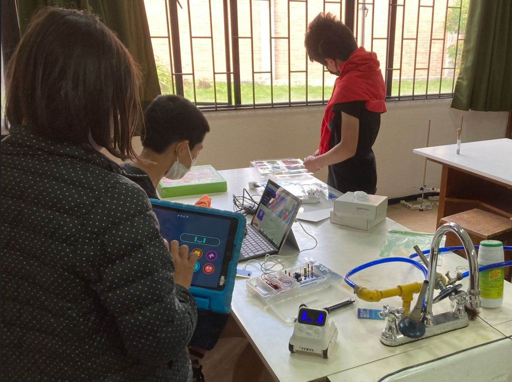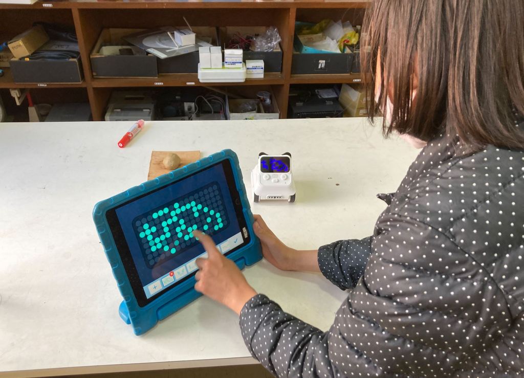 1人は「カエルの歌」のメロディを鳴らしたり、人感センサーでON-0FFを制御させたりするプログラムを組んでいます。もう1人は、プログラムコマンドを使って、描いたコースにロボットの車を走らせたり、そのロボットのモニターに泣いたり、笑ったりする表情をつけています。別の1人は、矢印のような命令プログラムを組んで、それをロボットに記憶させて前進後退や右折左折をさせて、ロボットがコースをゴールするのを目指しています。
