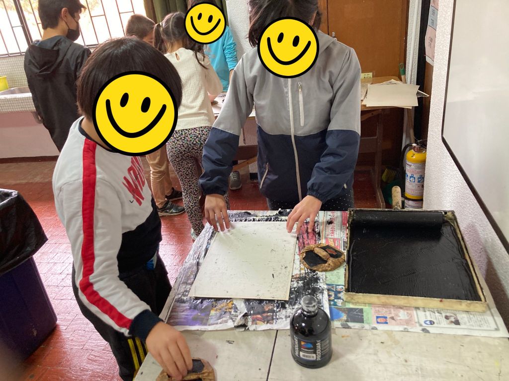 小学3年生から6年生の図工は、「彫ったり、刷ったりした形の感じ方を見つけ、表し方を工夫する」という内容で、木版画を学習しています。火曜日は、紙に刷りました。子どもたちは、友達と協力して行うことができました。版画の魅力について尋ねると、
