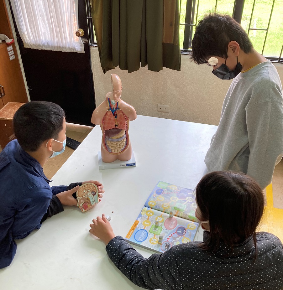 小学部6年生の理科では、教科書の終わりに付設されている「クイズすごろく」を用いて復習を行いました。さいころで進んだこまの場所で、問題を教師が出題します。正解だともう1つ進み、誤りだと1つ戻ります。「体のつくりとはたらき」の内容を尋ねましたが、彼らはよく理解していたので、後半は人体模型も用いながら、肝臓や腎臓などの発展的な内容を尋ねました。