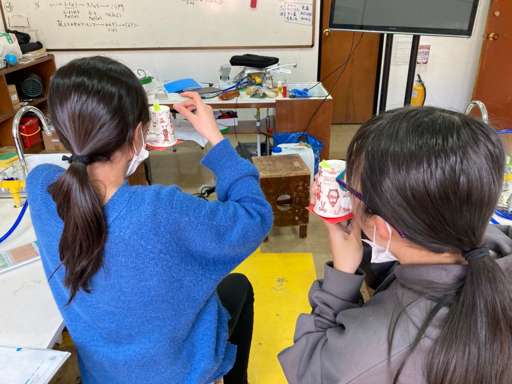 中学部1年生の理科は、音は音源が振動して鳴っていることを学びました。それを確かめる方法として、通称「踊るヘビ」と言われる実験装置を工作しました。声帯の振動が紙コップの底面に伝わります。その上に乗せているモールの毛は、一定方向に向かってとめてあるので円を作ると、振動が回転運動になります。そのため、紙コップに刺した紙の筒をくわえて声を出すと、モールで作ったとぐろを巻いたヘビが回りました。生徒の一人はモールにペットの絵を描いて貼り、犬が回るように作りました。