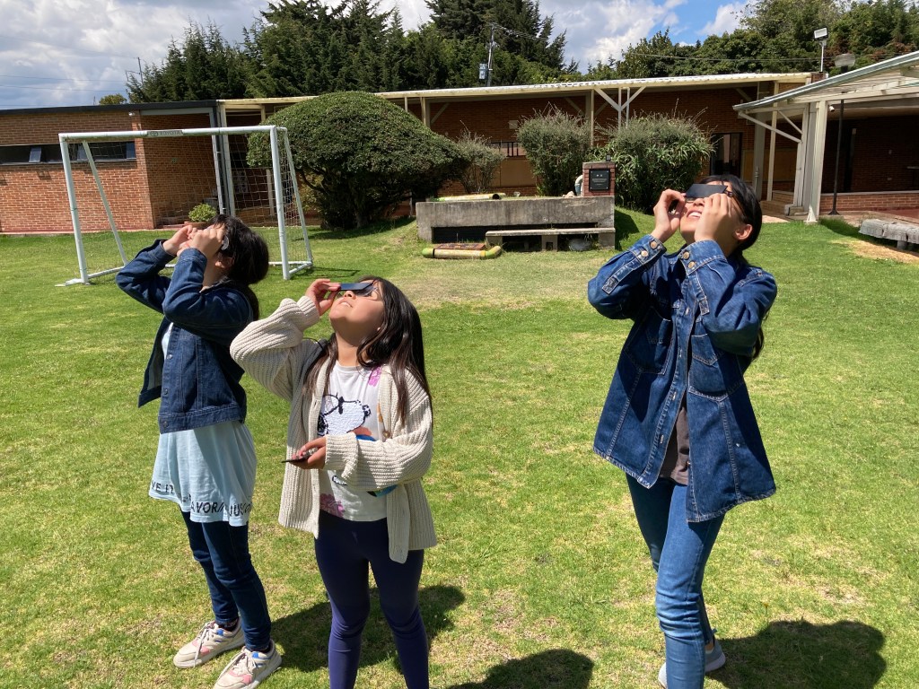 3年生の理科の学習で遮光板を扱いました。ボゴタでは、明後日14日(土)の午前11時48分から部分日食が始まるということで、他の子ども達も興味津々で遮光板を使い太陽を眺めていました。あいにく部分日食の日は登校日ではありませんが、自然が見せる神秘的な光景をぜひ生で見てほしいと思います。