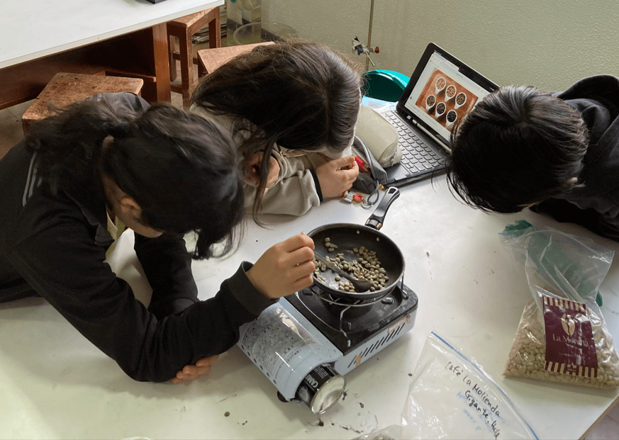 10月27日に、PTA主催で社会セミナーが行われ、JICAでコーヒーの栽培の支援をされている方のお話が、全児童生徒に向けて行われました。その時に頂いたコーヒーの生豆を理科の時間にフライパンで炒ってメイラード反応を見ました。ポップコーンのようにはじけたり、次第に茶色から黒みを増してきたりする様子、そしていい匂いに歓声が上がりました。その後、試飲の許可を得て、豆を砕いてドリップしてコーヒーにして味わいました。一層美味しく感じられました。
