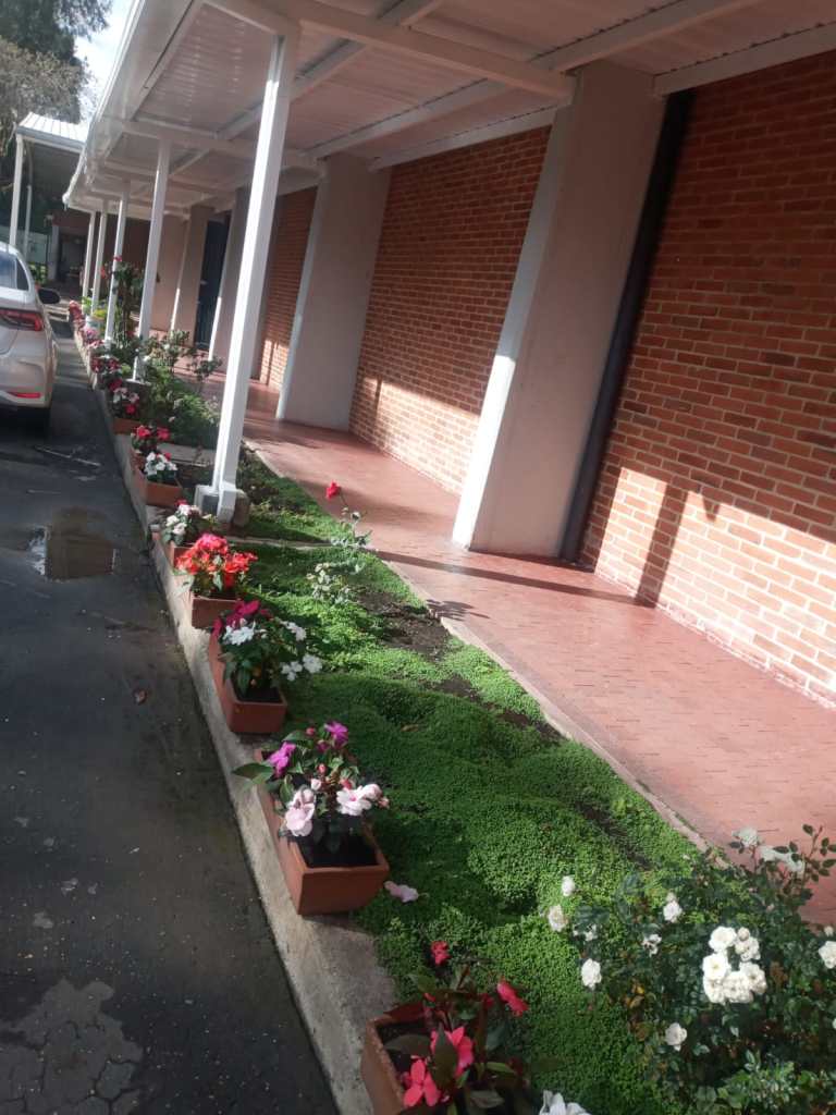 駐車場屋根交換工事も終わり、駐車場や校舎玄関前のお花の手入れをしています。