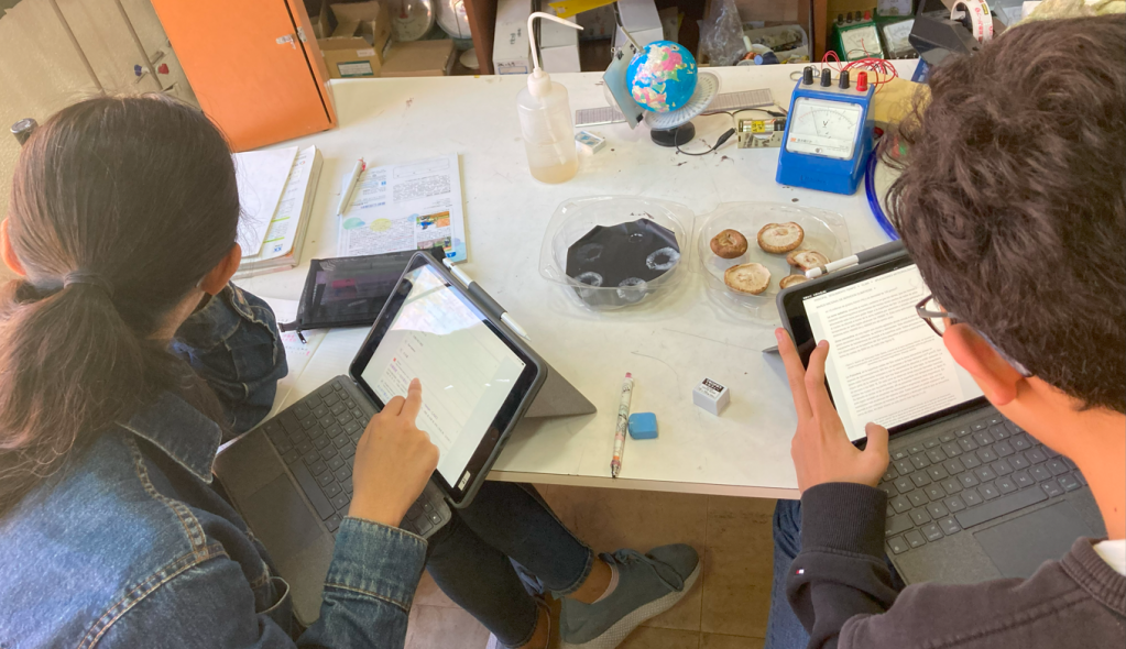 中学3年の理科では、終章の「自然界のつながり」の中で食物連鎖や生態系について学びます。その中で大きな役割を占める分解者のカビ・キノコ類についてその体と生態について観察・実験しました。生のシイタケが手に入ったので、柄を取って傘を上にして黒い紙の上において数日待ちました。シイタケをのけると、その形に白い模様ができていました。ひだの間でできた胞子が落ちたのです。この白い粉を集めて顕微鏡で見ました。600倍にしても小さな粒で、胞子がいかに小さく、空中を漂うことができるのかがわかりました。