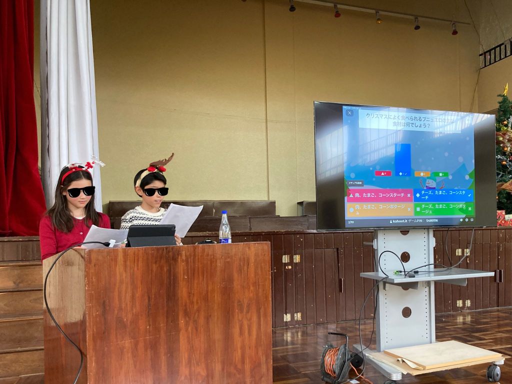 12月22日(金)は子どもたちが楽しみにしていたクリスマス集会が行われました。中学部が司会をし、他の学年がレクレーションを行いました。1・3年生の出し物は、「クリスマス手つなぎオニ」でした。折り紙で作ったクリスマスの飾りをつけて、オニから逃げ回りました。3回ほどやった後は、ヘトヘトになるほど、大興奮の鬼ごっこでした。4・5年生の出し物は、kahoot!で作ったクイズ大会でした。3、4人のチームに分かれ「コロンビアでは、クリスマスが始まる12月7日は何をするでしょう」などのクイズに答えていきました。答える時間が早いほど、点数が高くなるので、どの班も協力しながら行っていました。集会を通して、子どもたちのまた絆が強くなった行事でした。
