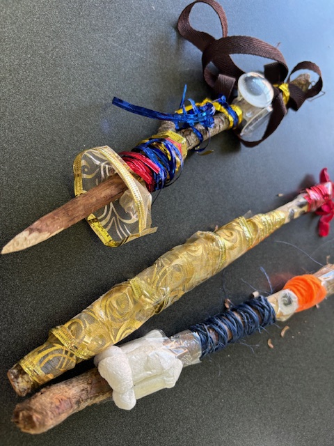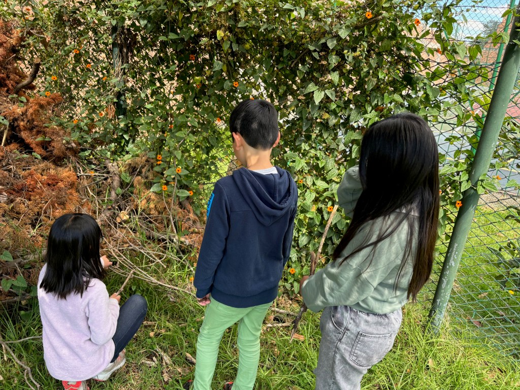 大グラウンドに行って、落ちている木の枝や葉を拾い、世界にたった一本のオリジナル鉛筆を作りました。最初は、枝を斜めに削ることに苦労していましたが、小刀の持ち方や削り方を工夫することで、スムーズに削れるようになってきました。最後は、自分で削った鉛筆で、いろいろな模様を楽しく描きました。子どもたちは、小刀で削る感触を楽しんだり、自分で作ったペンで描けることに感動したりしていました。いろいろな太さの線を描けるように、削り方を工夫する姿も見られました。