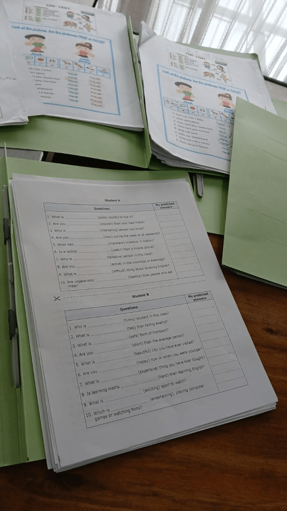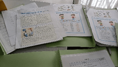 初級クラスでは、発達段階に応じて文法を取り入れて簡単な会話ができるように挑戦中です。 上級クラスでは、表現力を高めるために読み物などを使って学習を進めています。