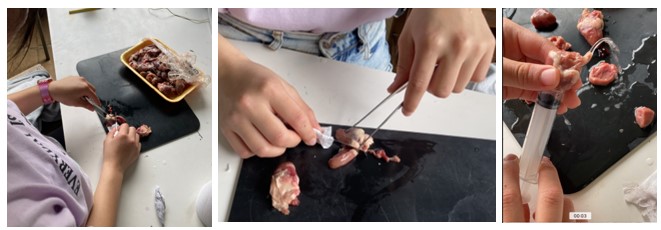小学校6年生理科では、「動物のからだのはたらき」の単元で、血液の働きとして心臓のつくりを学びます。中学2年生理科では、「人間の体の器官」として、より詳しく、心房と心室の役割を区別して弁や肺動脈、肺静脈まで学びます。今回、両方の学年で、食材の鶏の心臓(はつ)を用い、それを切って、4つの部屋やそのつながりを見つけました。どちらの授業でも最後は、筋肉が分厚い左心室に水を入れたシリンジを差し込んでピストンを押しました。水が出てきた管が大動脈だとわかりました。