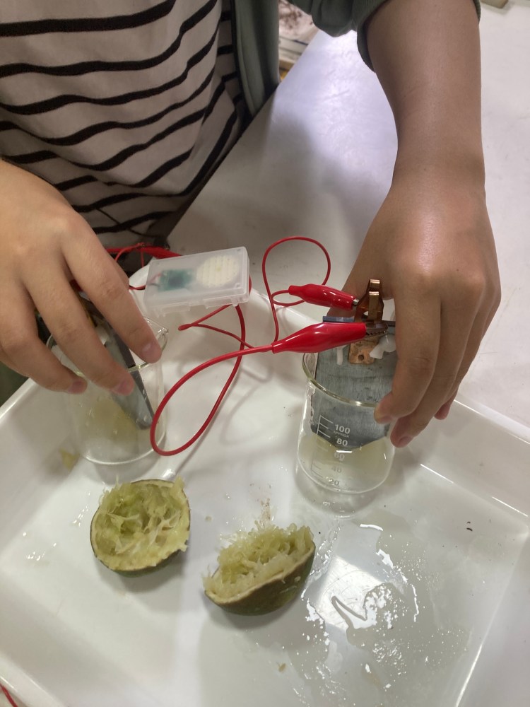 中学3年の理科で、イオンの勉強の一環で電池を勉強しています。ボルタ電池を学んだあと、身の回りのもので電池を作りました。レモンに、亜鉛と銅の電極を刺すと電流が流れます。1つのレモン電池では電子オルゴールがやっと鳴ったぐらいでしたが、2個直列にしたり、果汁を絞ると、LEDも点き、電子オルゴールの曲のメロディーよくわかりました。