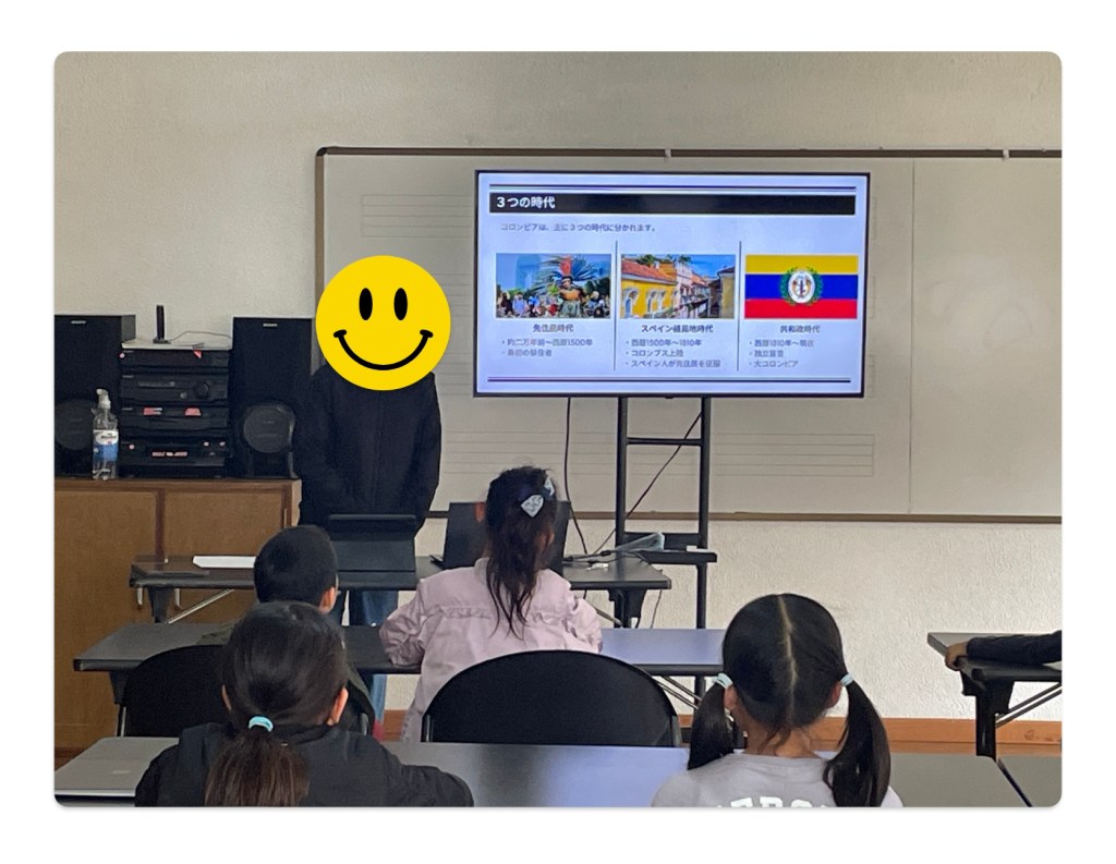 12月14日(土)に行われるコロンビア学習発表会に向けて、中間発表会を行いました。子どもたちは、「花」や「歴史」、「政治」など、コロンビアで暮らしていて疑問に思ったことや知りたいと思ったことからテーマを決め、総合の授業を中心に調べ学習をしています。また、インターネットで調べるだけではなく、現地の人にインタビューをしたり、実際に現地を訪れたりしながらコロンビアについての学習を進めています。今回の中間発表会で出てきた課題を改善し、本番の発表に向けてさらに学習を進めてほしいと思います。