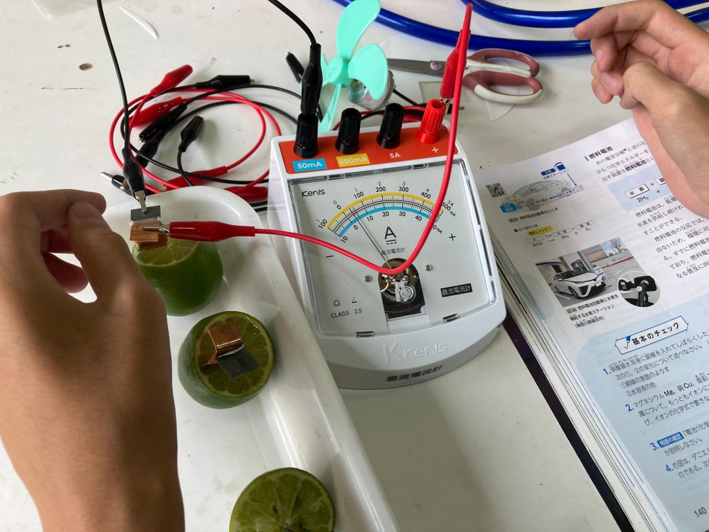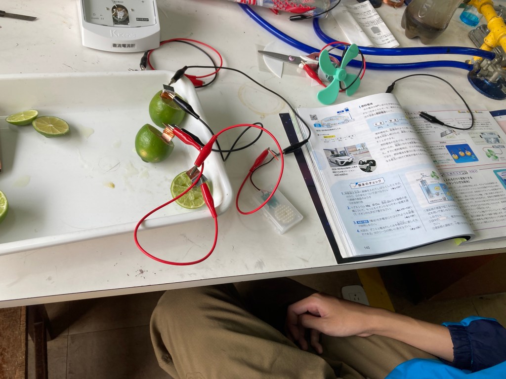 中学校3年生の理科で、イオンの学習に続いて電池を学びます。果物電池は、レモンの2つ切り1つでは電流はわずかでしたが、3つ直列につなぐと電子オルゴールが、曲名がわかるぐらいしっかり鳴りました。しかし微電流用のモーターは一瞬動くだけでした。先日行った備長炭電池では逆に微電流用のモーターは回りましたが、電子オルゴールは雑音程度しか鳴りませんでした。調べてみると、電子オルゴールは、やや電圧が上がらないと鳴らないようです。「電流と電圧の関係はおもしろいね」と関心が高まりました。