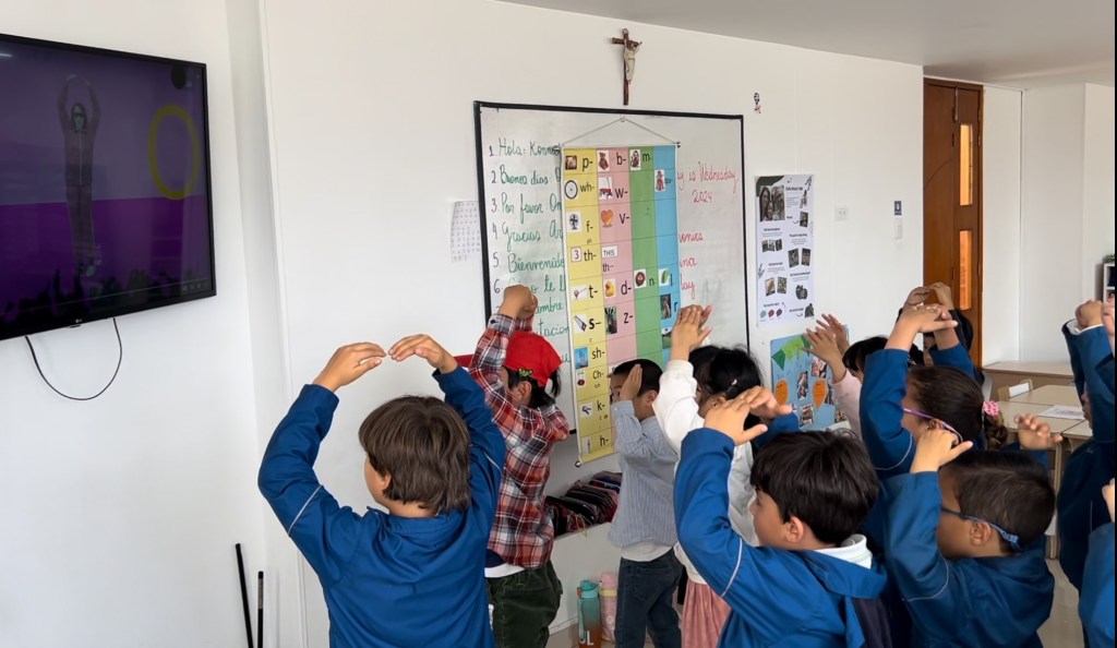 Maslow校との交流会では、ボゴタ日本人学校1、2年生5人は、英語の授業に参加させていただきました。最初に、一人一人を紹介してもらい、かわいい名札をいただきました。次にみんなで、アルファベットの歌をノリノリで歌い、授業は、クラスを5グループに分け、魚釣り、間違い探し、棒アートなどのゲームを通して、英語でコミュニュケーションを行う、という内容でした。マスローの子どもたちは、優しく、思いやりにあふれ、一人一人が積極的に関わろうとしてくれました。本校の子どもたちは、最初は、少し恥ずかしそうにしていましたが、お礼の歌を歌い、給食を共に食べ、遊び時間になる頃には、子どもたちだけで楽しい時間を過ごしました。