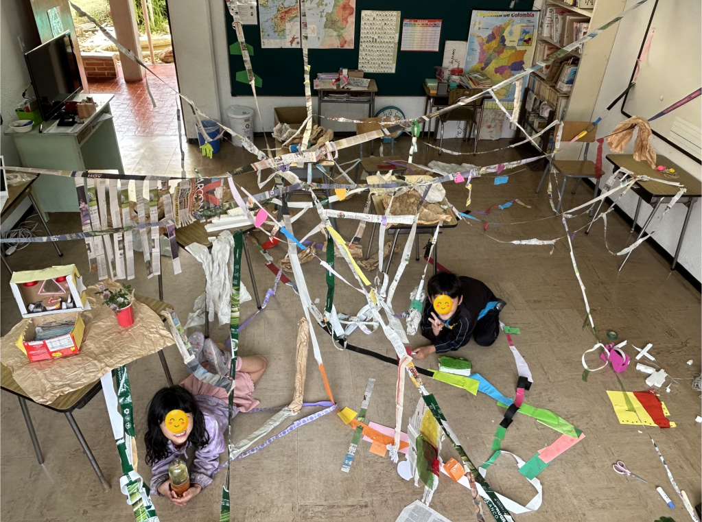 「どこからつなごうかな?」「どんなふうにつなごうかな?」「トンネルみたいにしようかな?」「友だちとつなごうかな?」「どんな色の紙にしようかな?」「つるしてみようかな?」1,2年生5人が、思い思いに作った紙が、最後に全部つながり、心もつながりました!!