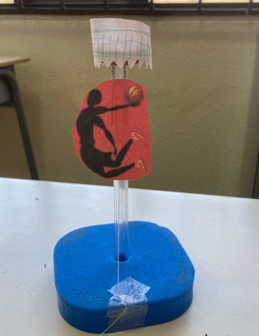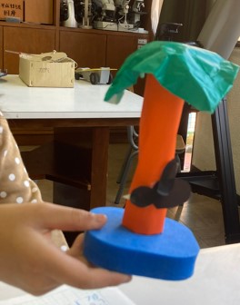 「空中にバスケットボール選手が浮いているのはなぜか?」、その仕組みを考えました。選手の裏に糸のついたゼムクリップが貼り付けられ、バスケットゴールの裏に強い磁石があるのに気づきました。それを参考に、木の周りで浮いて飛んでいる小鳥のおもちゃを作りました。電気の方は、電池1つからの並列つなぎで、2つの豆電球に星形の覆いをした灯りが、ツリーにともりました。