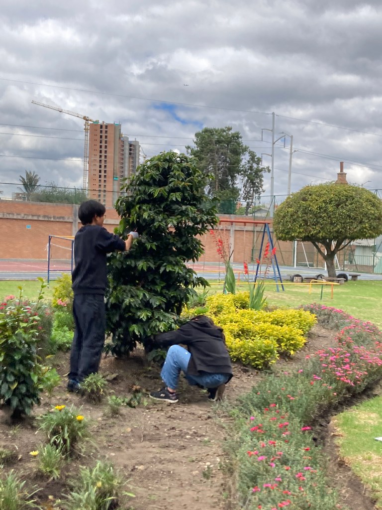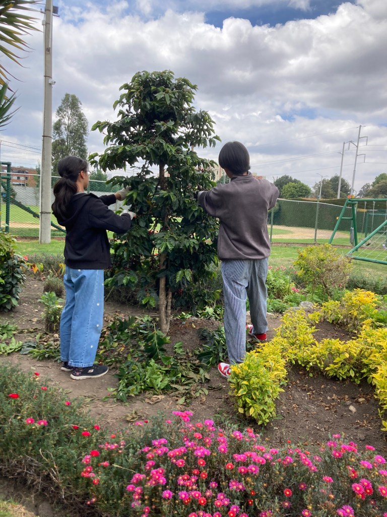 中学校技術では、材料の加工、情報技術などと共に、栽培の分野を学びます。先日はトマトの摘芽や支柱で支える誘引などを行い、先週と今週は、校庭のコーヒーの木を使って剪定をしました。徒長枝と呼ばれる脇の枝を切ります、そちらに養分を奪われないで、花や実に養分が行きわたり、良いコーヒー豆を収穫するためです。中学生二人は、最初は戸惑いながらも、思い切って鋏を入れるようになり、樹形も美しく仕上げました。次に収穫して、おいしいコーヒーが飲めるのが楽しみになりました。