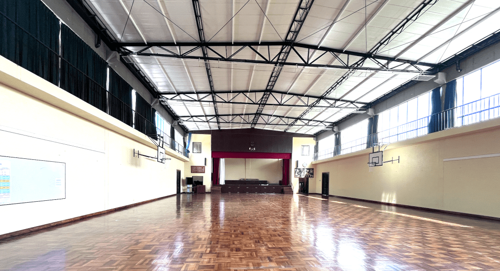 体育の授業、学芸会・集会などの行事で使います。雨の日は、全員でドッジボールを楽しんでいます。