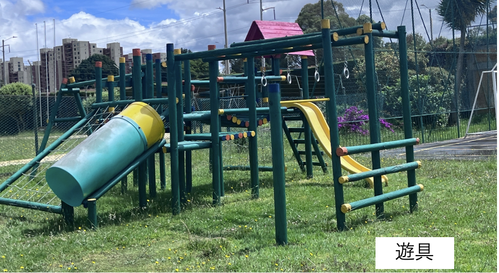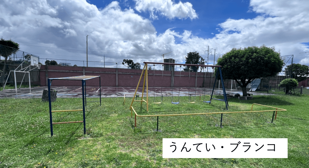 サッカーゴール、バスケットコート、登り棒、鉄棒、ブランコ、うんてい、コンビネーション遊具。たくさんの遊具があります。